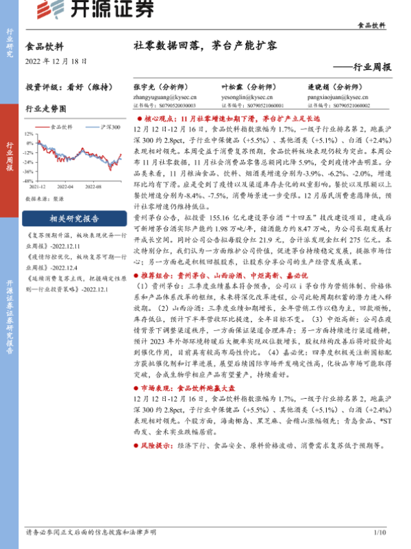 【开源证券】【20221218】食品饮料行业周报:社零数据回落,茅台产能扩容-10页 行业研究