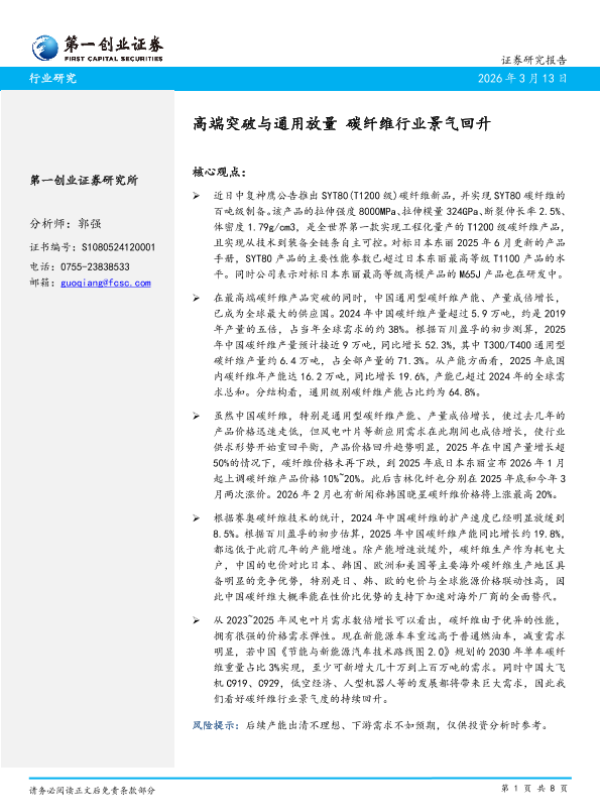 【第一创业证券】【202603】高端突破与通用放量碳纤维行业景气回升-8页 证券期货研究报告