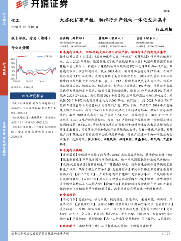 【开源证券】【20200308】化工行业周报:大炼化扩张严控,助推行业产能向一体化龙头集中-27页 行业研究