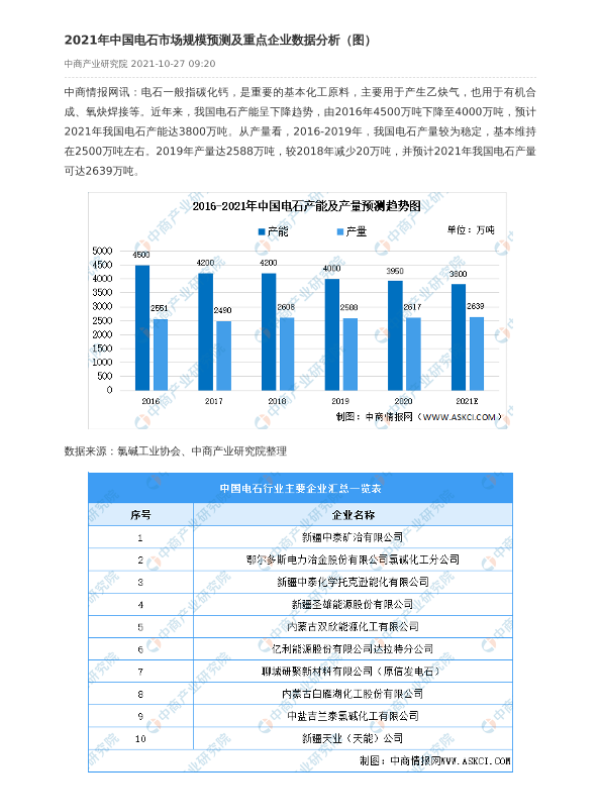 【中商产业研究院】【2021】2021年中国电石市场规模预测及重点企业数据分析-2页 行业研究