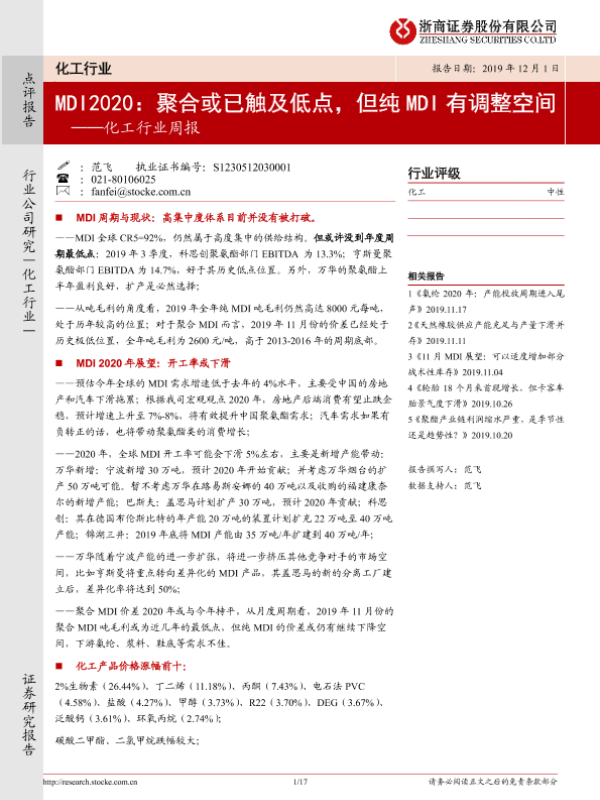 【浙商证券】【20191201】20191201-浙商证券-化工行业周报:MDI2020:聚合或已触及低点,但纯MDI有调整空间-17页 行业研究