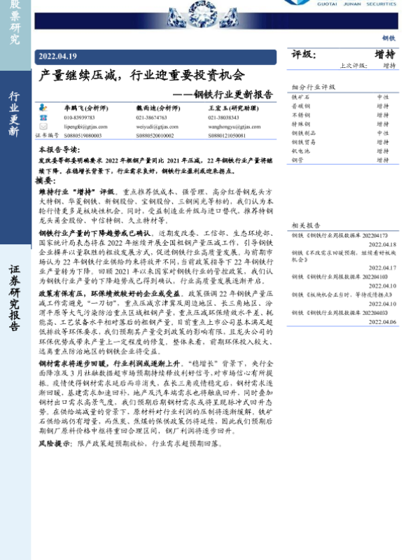 【国泰君安证券】【20220419】产量继续压减,行业迎重要投资机会——钢铁行业更新报告-3页 行业研究