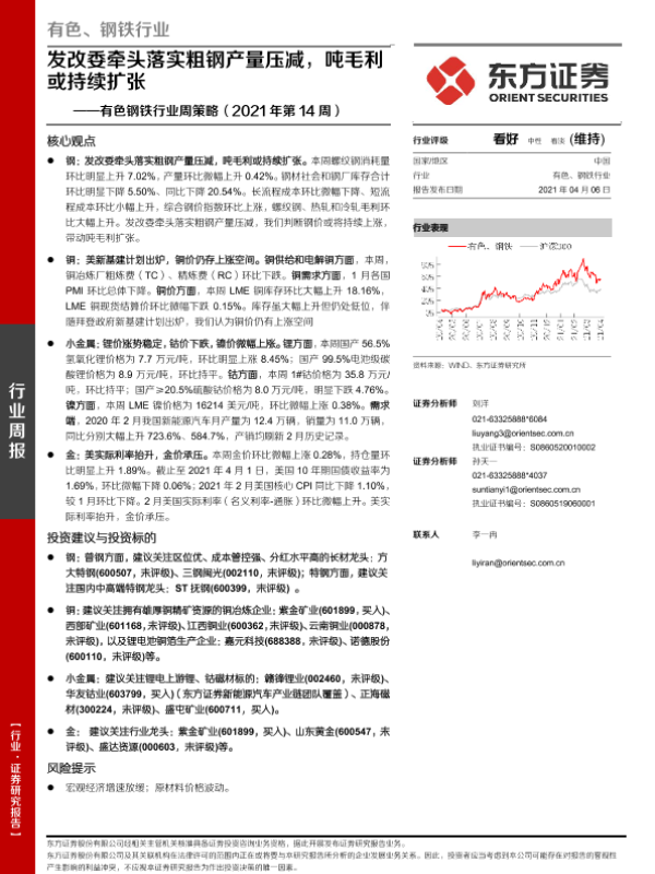 【东方证券】【20210406】有色钢铁行业周策略(2021年第14周):发改委牵头落实粗钢产量压减,吨毛利或持续扩张-27页 行业研究