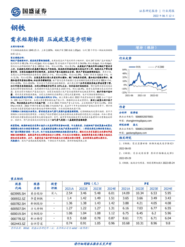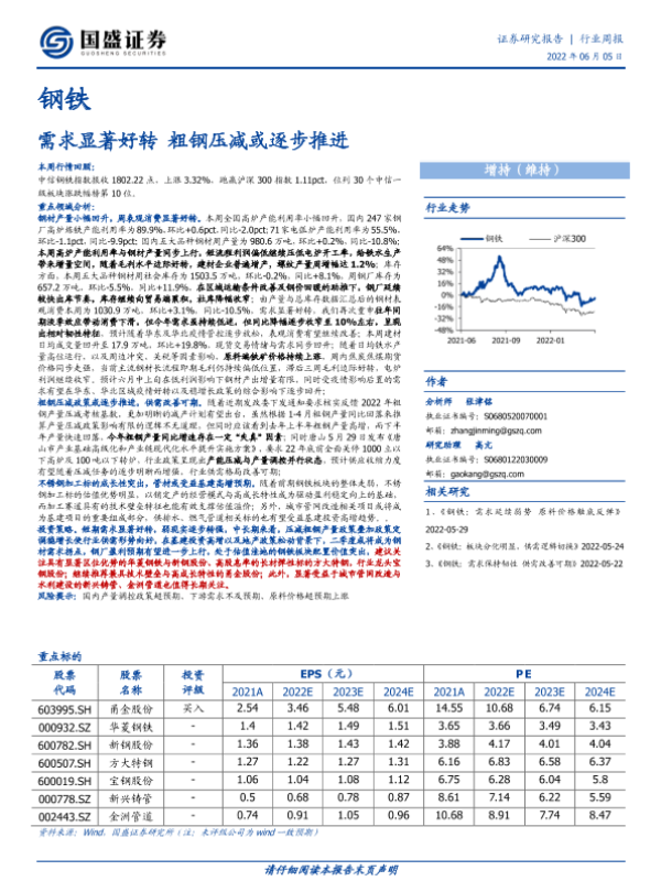 【国盛证券】【20220605】20220605-国盛证券-钢铁行业周报:需求显著好转 粗钢压减或逐步推进-15页 行业研究