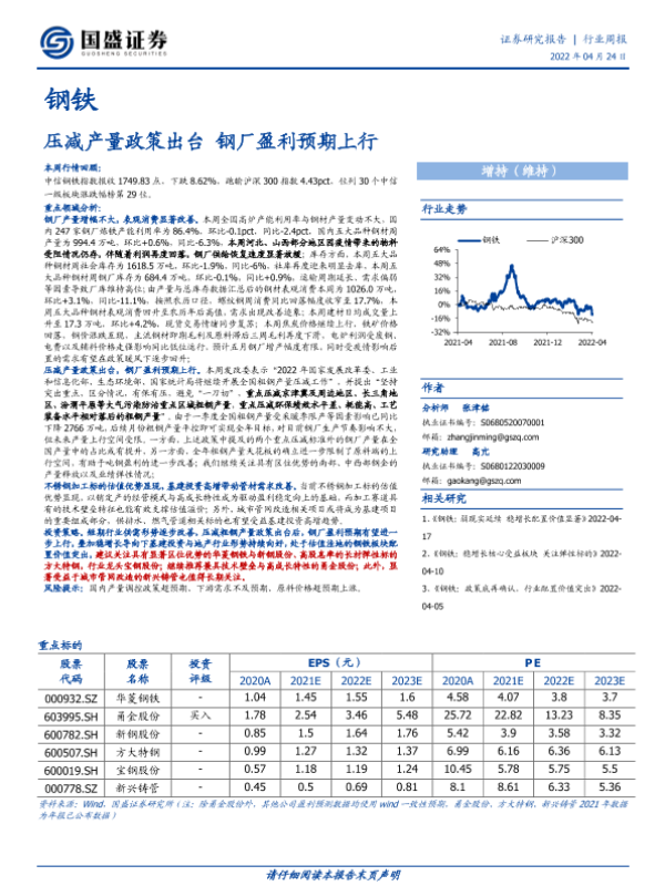 【国盛证券】【20220424】20220424-国盛证券-钢铁行业周报:压减产量政策出台 钢厂盈利预期上行-15页 行业研究
