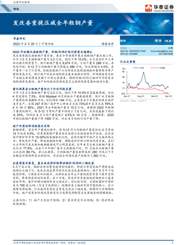 【华泰证券】【20220420】钢铁行业动态点评:发改委重提压减全年粗钢产量-5页 行业研究