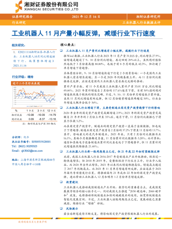 【湘财证券】【20211216】工业机器人行业数据点评:工业机器人11月产量小幅反弹,减缓行业下行速度-4页 行业研究