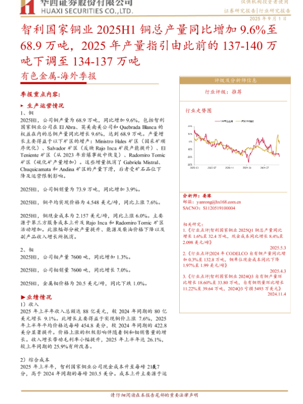 【智利国家铜业公司】【20250901】智利国家铜业-2025H1铜总产量同比增加9.6%至68.9万吨,2025年产量指引由此前的137-140万吨下调至134-137万吨-8页 证券期货研究报告