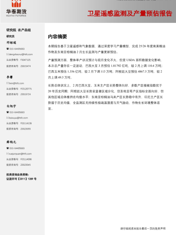 【华泰期货】【202603】卫星农业专题_卫星遥感监测及产量预估报告-19页 证券期货研究报告