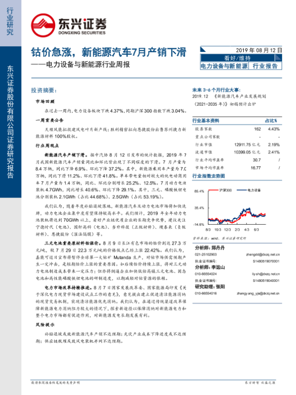 【东兴证券】【20190812】电力设备与新能源行业周报:钴价急涨,新能源汽车7月产销下滑-14页 行业研究