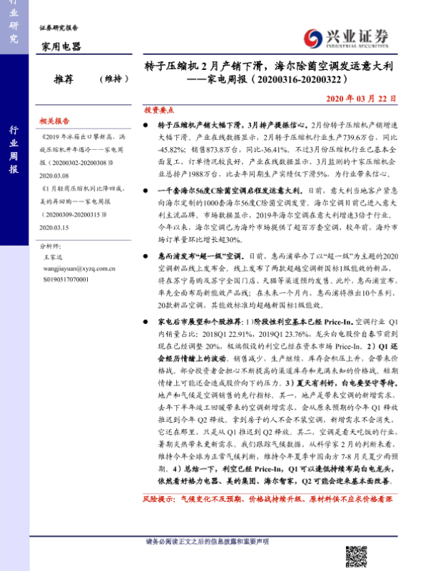 【兴业证券】【20200322】20200322-兴业证券-家电周报:转子压缩机2月产销下滑,海尔除菌空调发运意大利-8页 行业研究