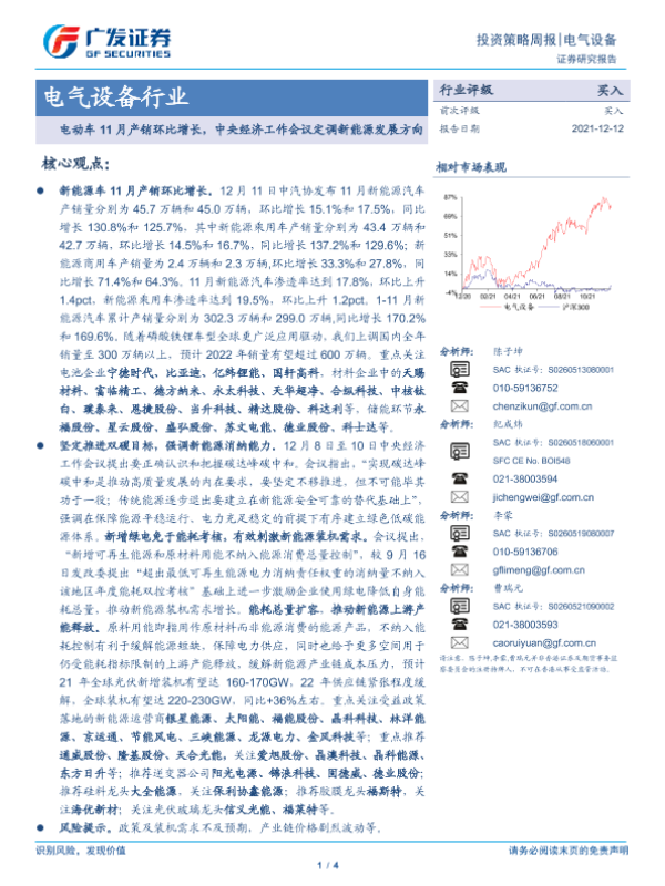 【广发证券】【20211212】20211212-广发证券-电气设备行业投资策略周报:电动车11月产销环比增长,中央经济工作会议定调新能源发展方向-4页 行业研究