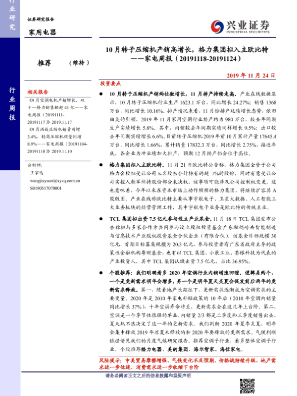 【兴业证券】【20191124】10月转子压缩机产销高增长,格力集团拟入主欧比特 ——家电周报(20191118-20191124)-10页 行业研究