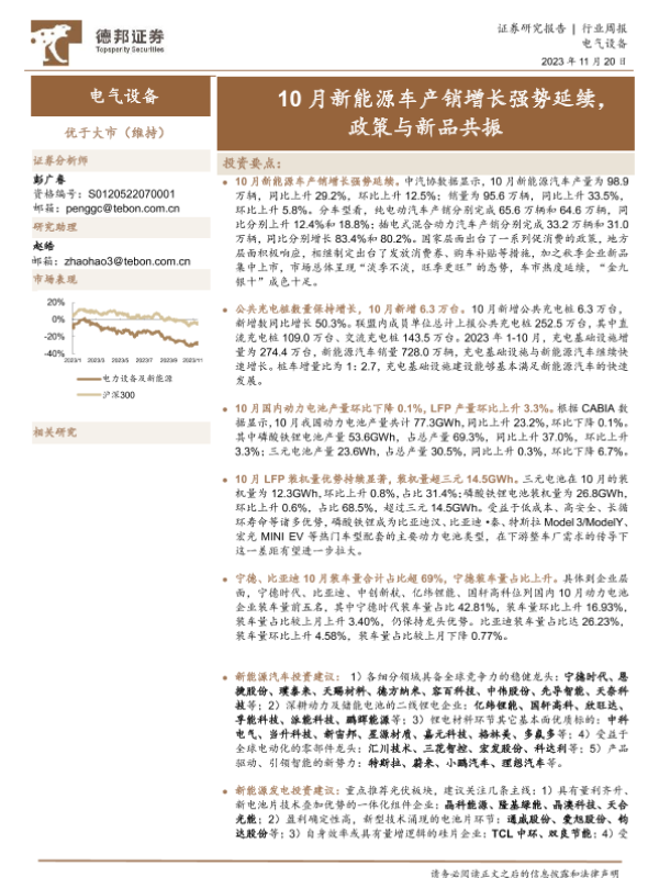 【德邦证券】【20231120】20231120-德邦证券-电气设备行业周报:10月新能源车产销增长强势延续,政策与新品共振-13页 行业研究