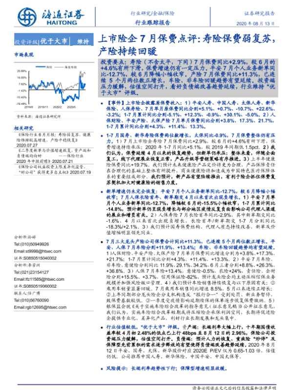 【海通证券】【20200813】上市险企7月保费点评:寿险保费弱复苏,产险持续回暖-5页 行业研究