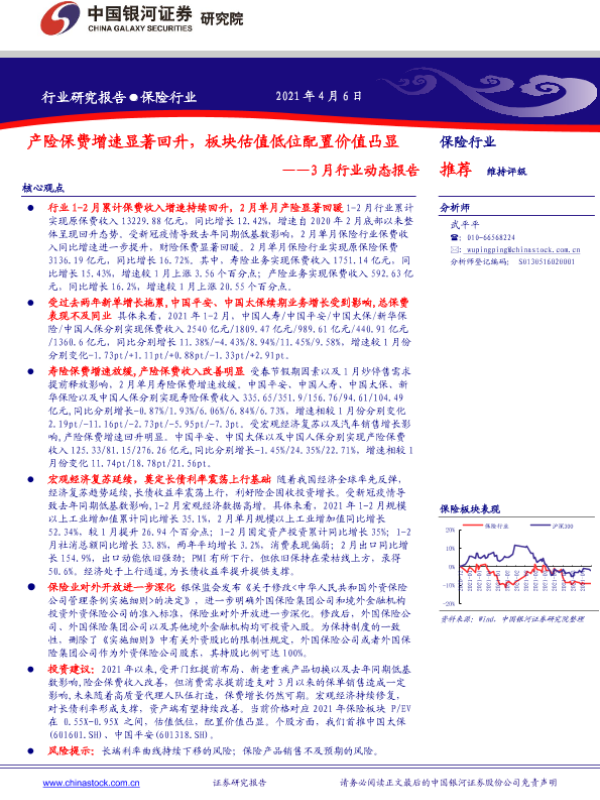 【银河证券】【20210406】保险行业3月行业动态报告:产险保费增速显著回升,板块估值低位配置价值凸显-17页 行业研究