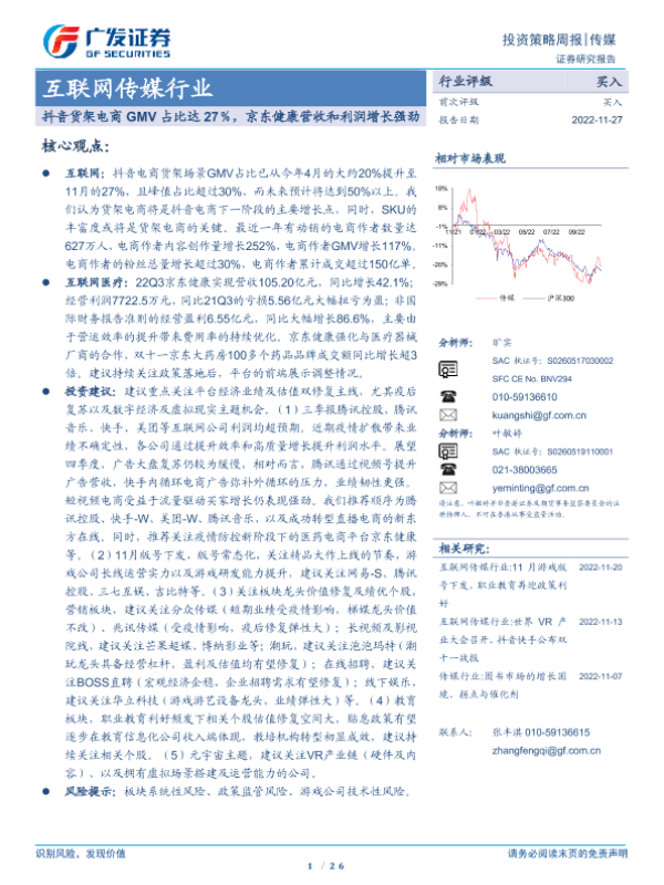 【广发证券】【20221127】互联网传媒行业:抖音货架电商GMV占比达27%,京东健康营收和利润增长强劲-26页 行业研究