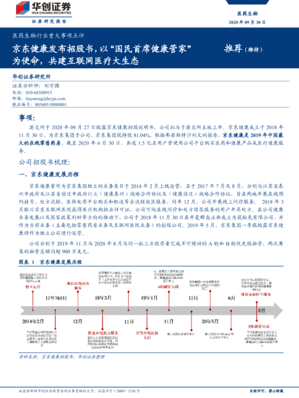 【华创证券】【20200930】医药生物行业重大事项点评:京东健康发布招股书,以“国民首席健康管家”为使命,共建互联网医疗大生态-6页 招股书