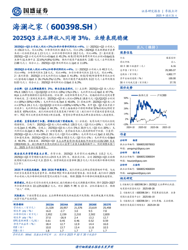 【国盛证券】【202510】2025Q3主品牌收入同增3%,业绩表现稳健-3页 证券期货研究报告