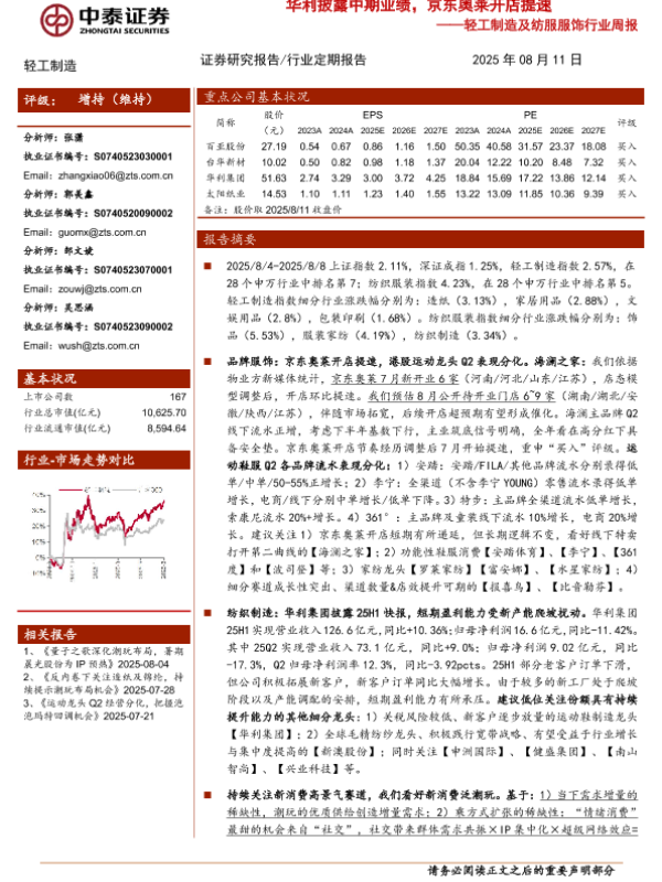 【中泰证券】【20250811】轻工制造及纺服服饰行业周报:华利披露中期业绩,京东奥莱开店提速-18页 证券期货研究报告