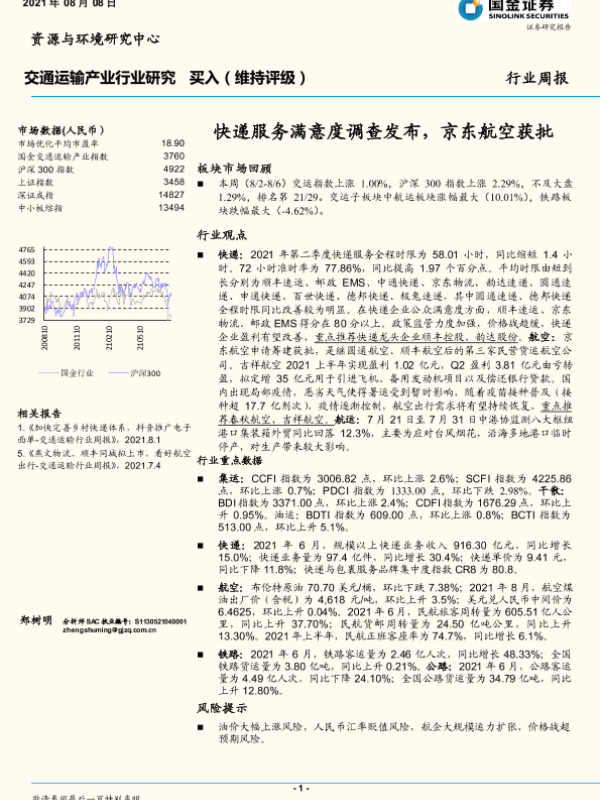 【国金证券】【20210808】交通运输产业行业研究:快递服务满意度调查发布,京东航空获批-14页 行业研究