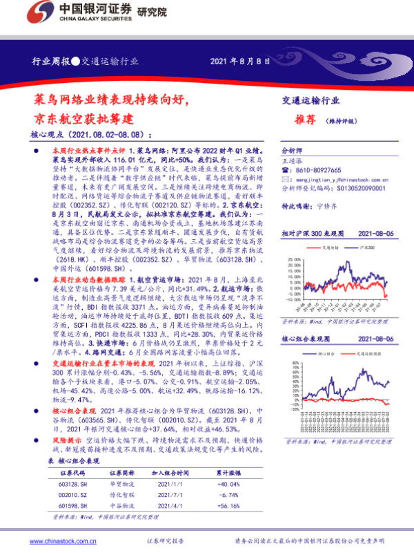 【银河证券】【20210808】交通运输行业周报:菜鸟网络业绩表现持续向好,京东航空获批筹建-20页 行业研究