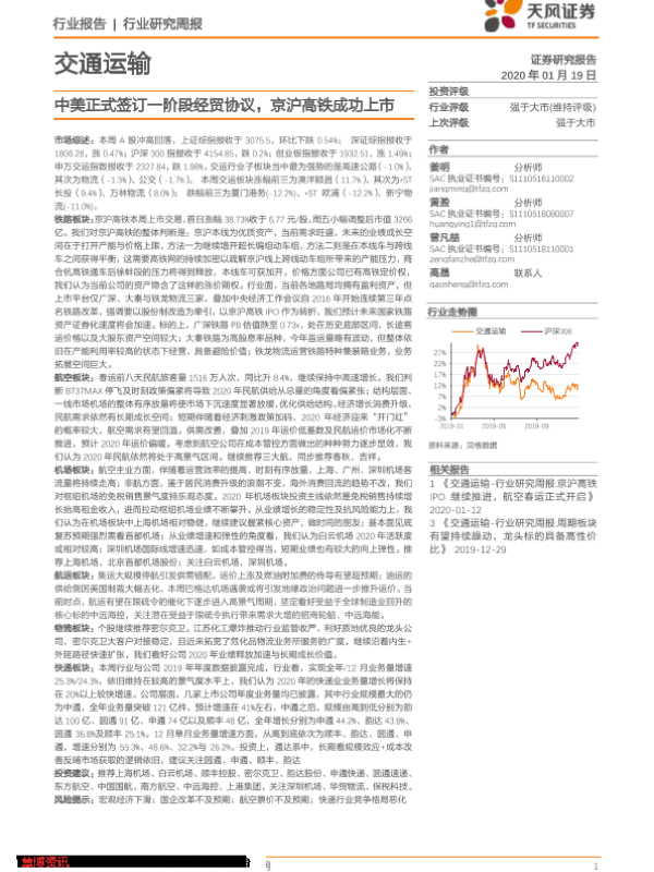 【天风证券】【20200119】交通运输行业研究周报:中美正式签订一阶段经贸协议,京沪高铁成功上市-17页 行业研究
