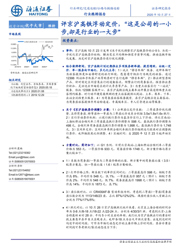【海通证券】【20201027】评京沪高铁浮动定价,“这是公司的一小步,却是行业的一大步”-3页 行业研究