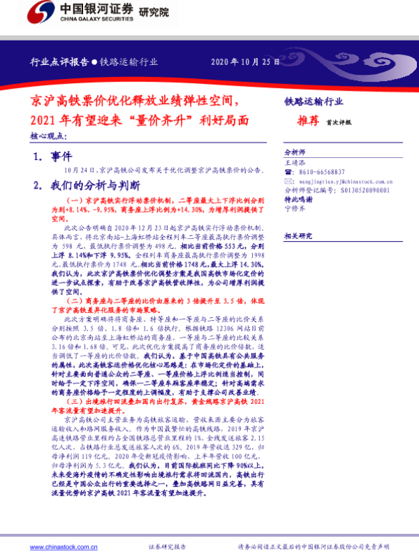 【银河证券】【20201025】铁路运输行业:京沪高铁票价优化释放业绩弹性空间-4页 行业研究