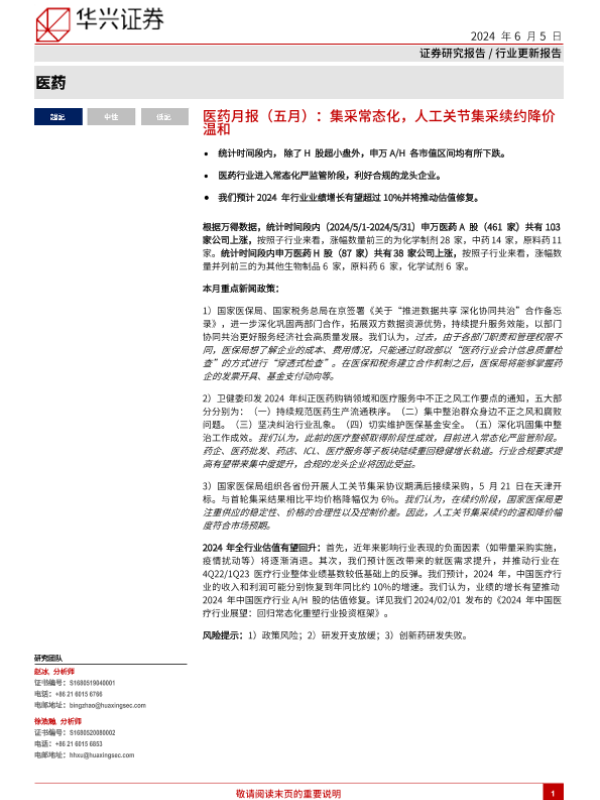 【华兴证券】【20240605】医药月报(五月):集采常态化,人工关节集采续约降价温和-12页 行业研究