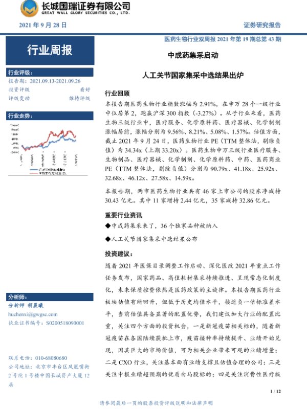 【长城国瑞证券】【20210928】医药生物行业双周报:中成药集采启动 人工关节国家集采中选结果出炉-12页 行业研究