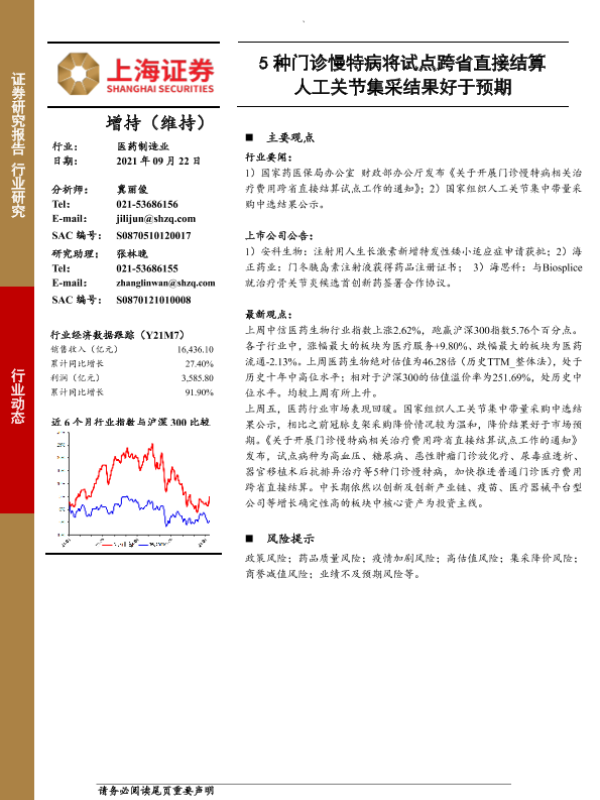 【上海证券】【20210922】5种门诊慢特病将试点跨省直接结算 人工关节集采结果好于预期-9页 行业研究