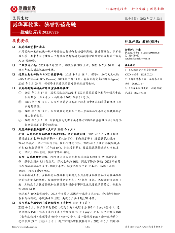 【浙商证券】【20230723】医药生物投融资周报:诺华再收购,德睿智药获融-16页 行业研究