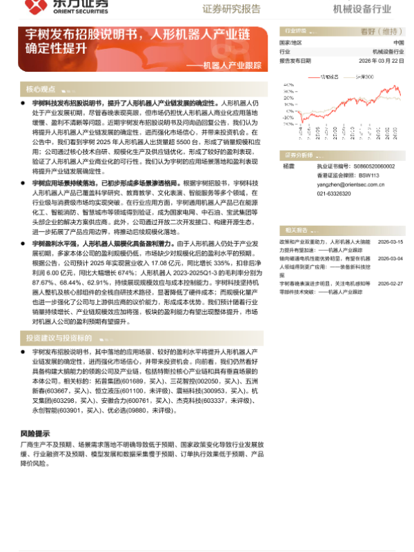【东方证券】【202603】机械设备行业动态跟踪 ——宇树发布招股说明书,人形机器人产业链确定性提升-4页 证券期货研究报告