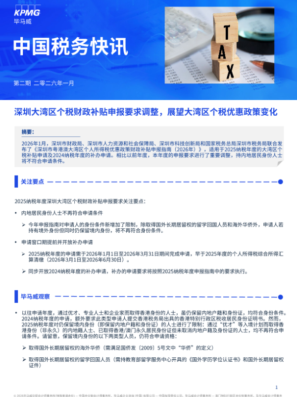 【毕马威华振会计师事务所(特殊普通合伙)&毕马威企业咨询(中国)有限公司&毕马威会计师事务所&毕马威会计师事务所】【202601】深圳大湾区个税财政补贴申报要求调整,展望大湾区个税优惠政策变化-3页 政策文件