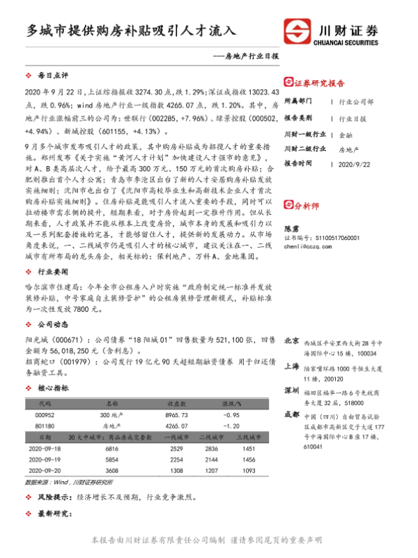 【川财证券】【20200922】多城市提供购房补贴吸引人才流入-3页 证券期货研究报告