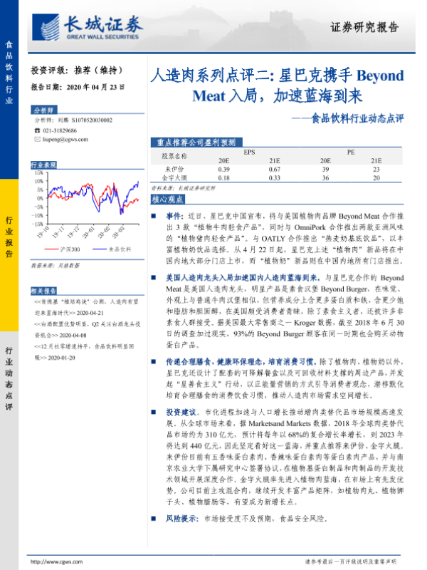 【长城证券】【20200423】食品饮料行业动态点评:人造肉系列点评二:星巴克携手Beyond Meat入局,加速蓝海到来-2页 行业研究