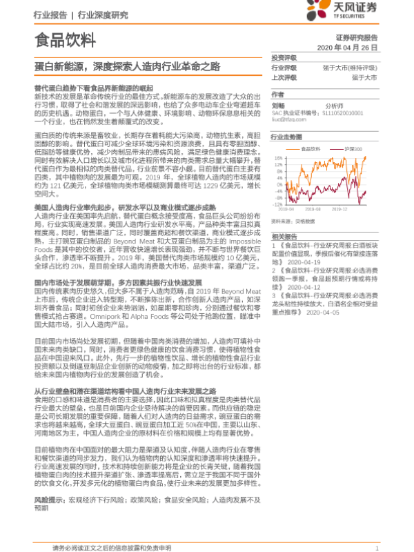 【天风证券】【20200426】食品饮料行业深度研究:蛋白新能源,深度探索人造肉行业革命之路-29页 行业研究