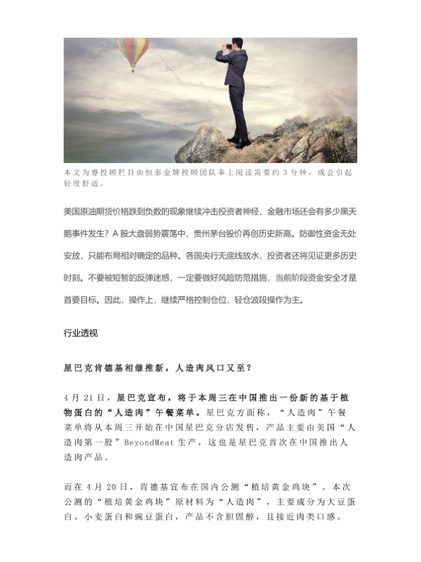 【恒泰证券】【20200424】20200424-恒泰证券-行业透视:星巴克肯德基相继推新,人造肉风口又至?-4页 行业研究