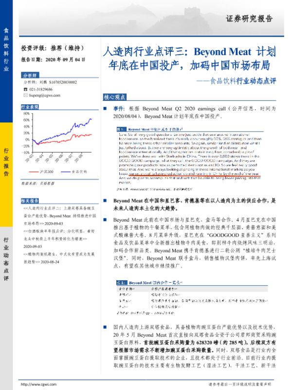 【长城证券】【20200904】食品饮料行业动态点评:人造肉行业点评三:Beyond Meat计划年底在中国投产,加码中国市场布局-3页 行业研究