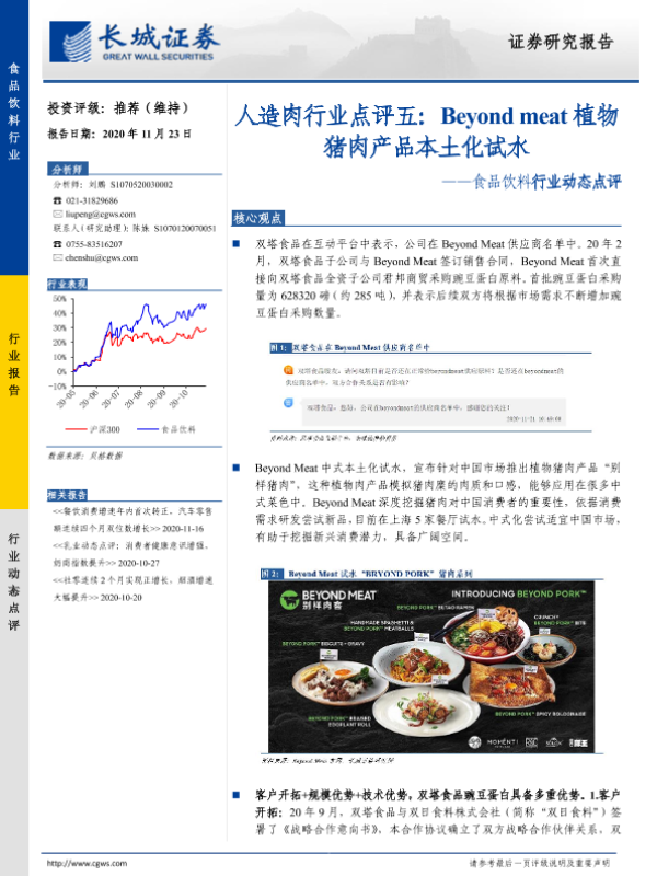 【长城证券】【20201123】食品饮料行业动态点评-人造肉行业点评五:Beyond meat植物猪肉产品本土化试水-3页 行业研究