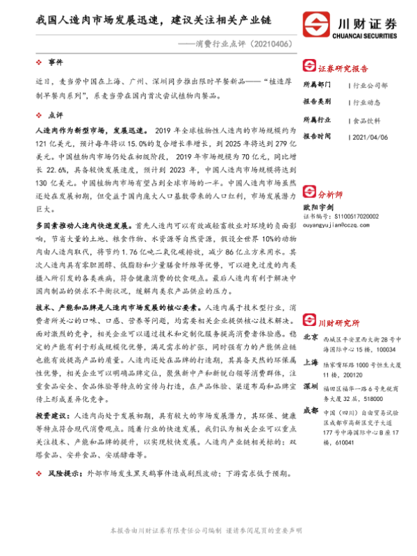 【川财证券】【20210406】消费行业点评:我国人造肉市场发展迅速,建议关注相关产业链-2页 证券期货研究报告