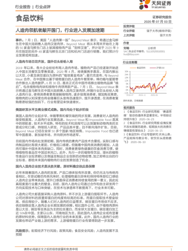 【天风证券】【20200703】食品饮料行业点评:人造肉领航者敲开国门,行业进入发展加速期-2页 行业研究