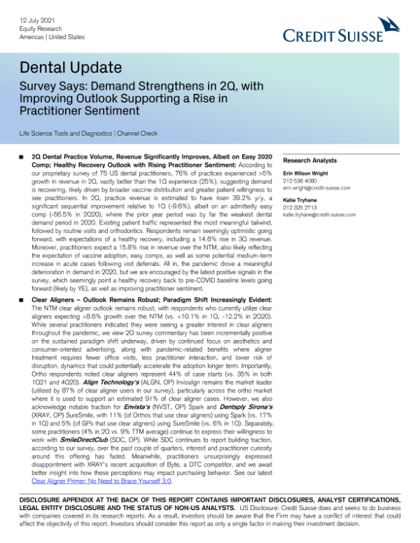 【瑞信】【20210712】瑞信-美股医疗保健行业-牙科:第二季度需求增强,前景改善支持了从业者情绪上升-61页 行业研究