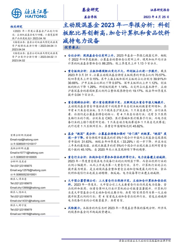 【海通证券】【20230425】主动股混基金2023年一季报分析:科创板配比再创新高,加仓计算机和食品饮料减持电力设备-16页 行业研究