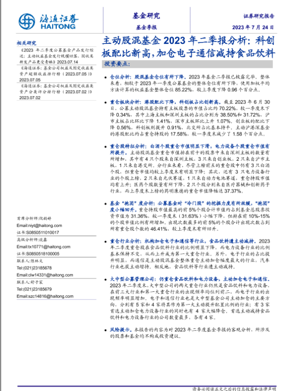 【海通证券】【20230724】主动股混基金2023年二季报分析:科创板配比新高,加仓电子通信减持食品饮料-16页 行业研究