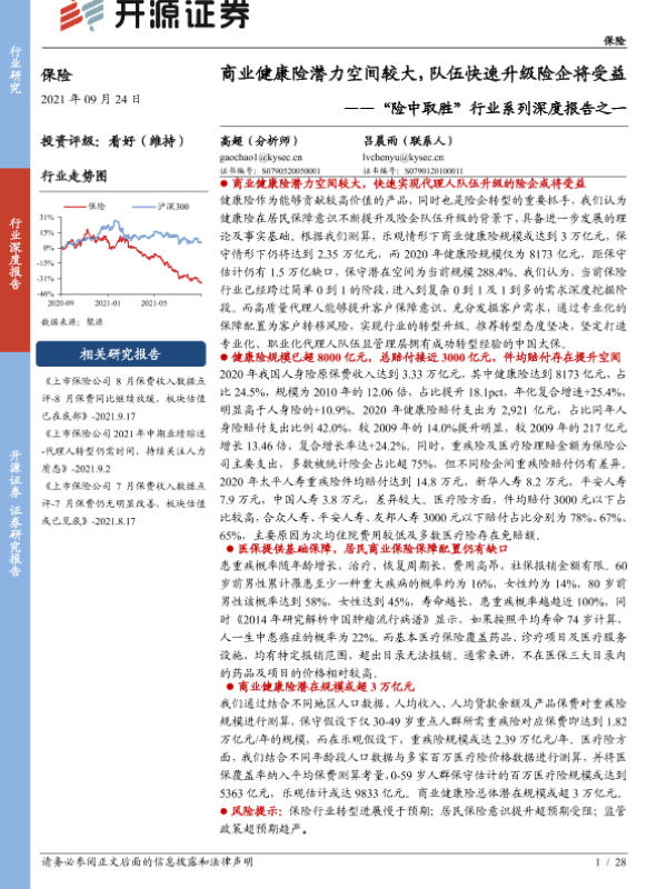 【开源证券】【20210924】保险行业“险中取胜”行业系列深度报告之一:商业健康险潜力空间较大,队伍快速升级险企将受益-28页 行业研究
