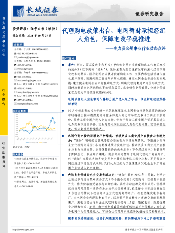 【长城证券】【20211027】电力及公用事业行业动态点评:代理购电政策出台,电网暂时承担经纪人角色,保障电改平稳推进-3页 行业研究
