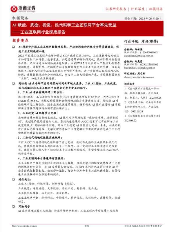 【浙商证券】【20230829】工业互联网行业深度报告:AI赋能,质检、视觉、低代码和工业互联网平台率先受益-26页 行业研究
