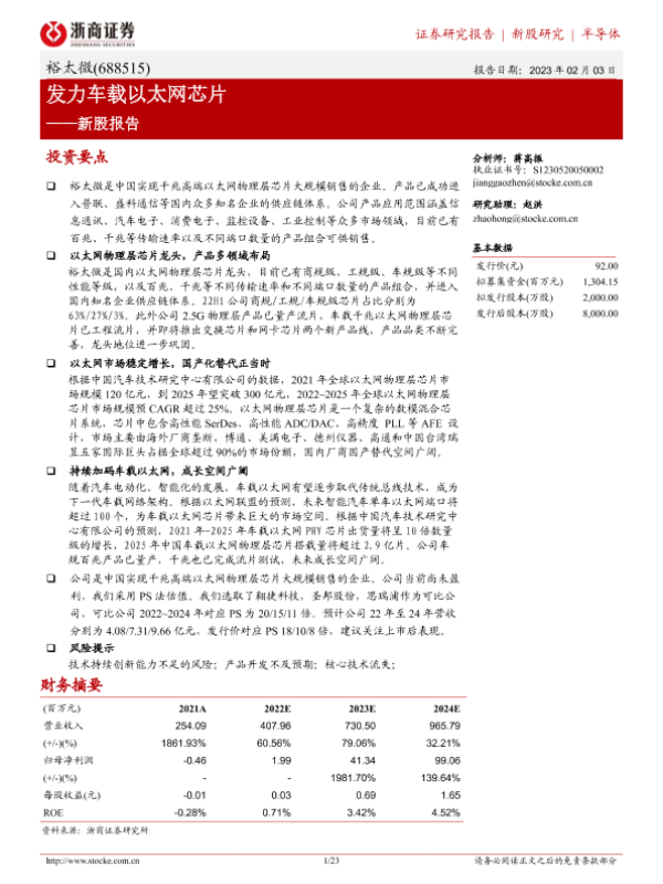 【浙商证券】【20230203】裕太微688515.SH新股报告:发力车载以太网芯片-23页 行业研究